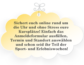 Bitte füllen Sie das Anmeldeformular aus, um an den Sport- und Erlebniswochen teilzunehmen. Wir schicken Ihnen anschließend die Zahlungsmodalitäten per Mail und bei erfolgtem Zahlungseingang lassen wir Ihnen eine Zahlungsbestätigung zukommen. Genauere Informationen zum Ablauf und Treffpunkt bekommen Sie ca. 10 Tage vor dem Start der Sport- und Erlebniswoche. Wir freuen uns über zahlreiche Anmeldungen!